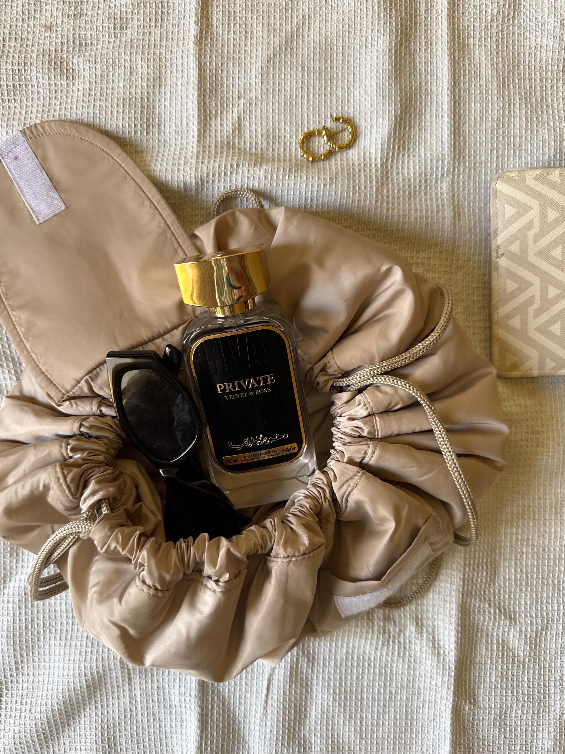 Made from smooth, lightweight fabric with a secure drawstring closure, this pouch keeps cosmetics, perfumes, and daily essentials organized and protected.