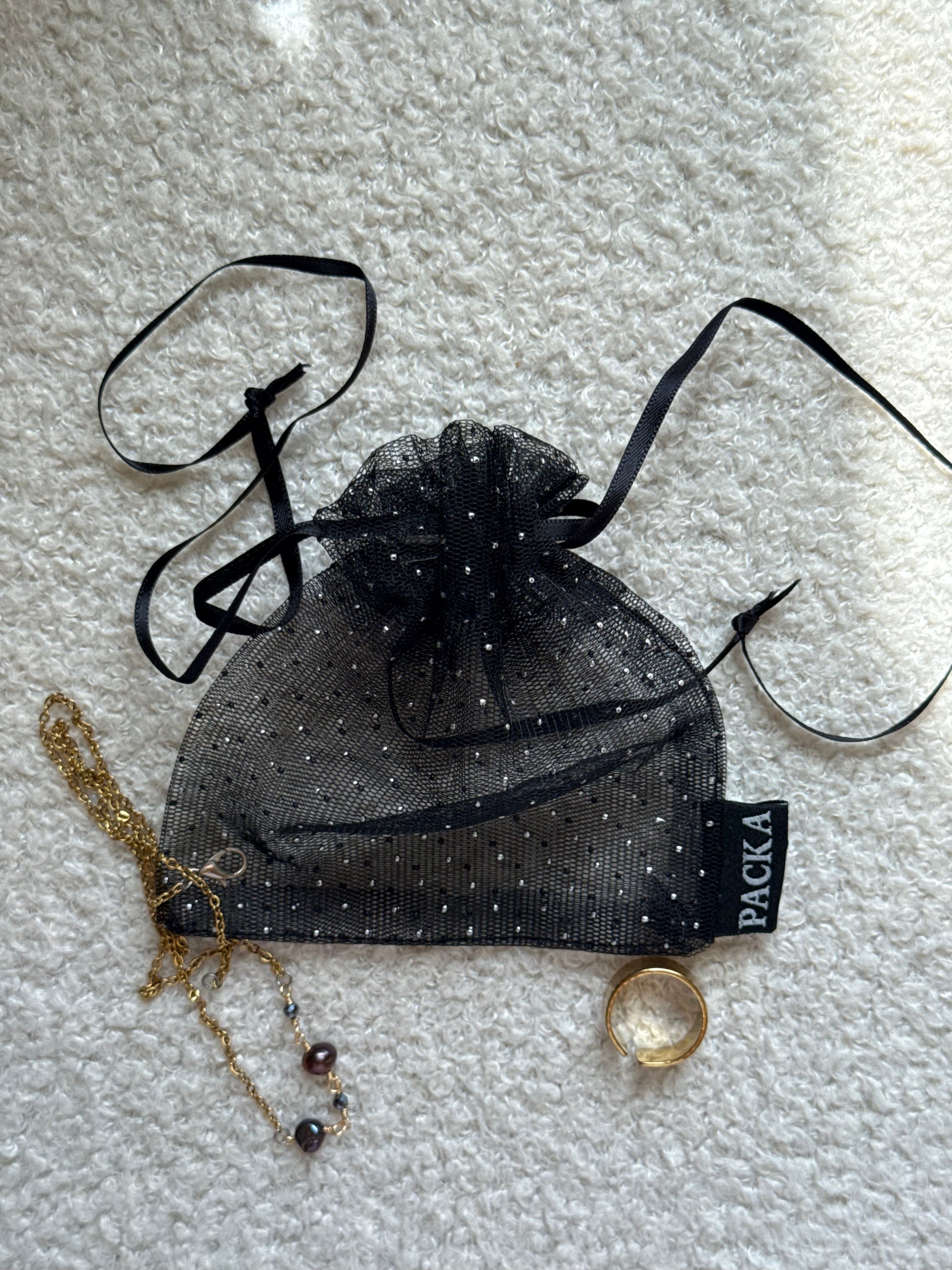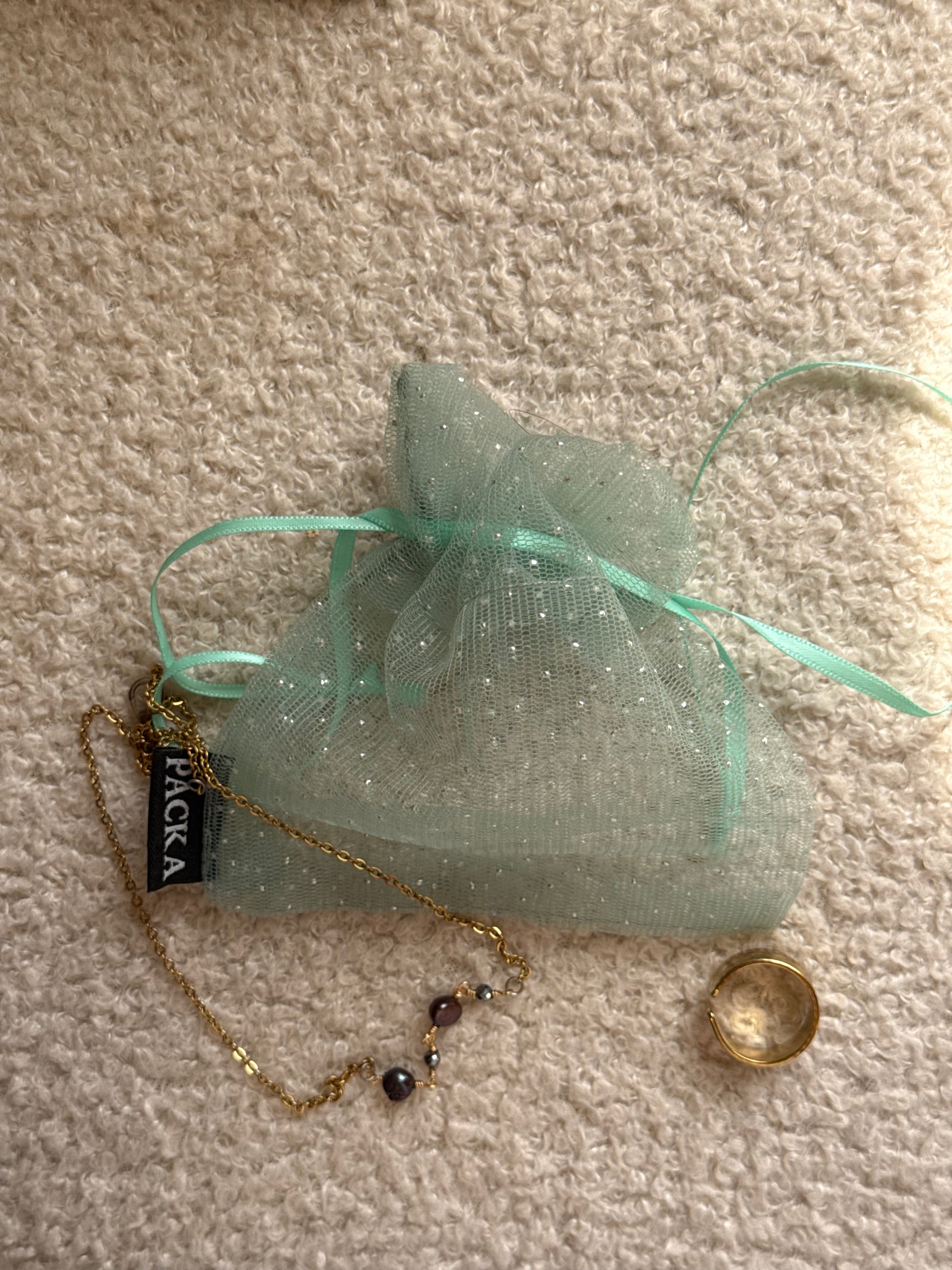 Made from lightweight, semi-transparent organza fabric with subtle shimmer, this pouch beautifully showcases small items while keeping them secure.