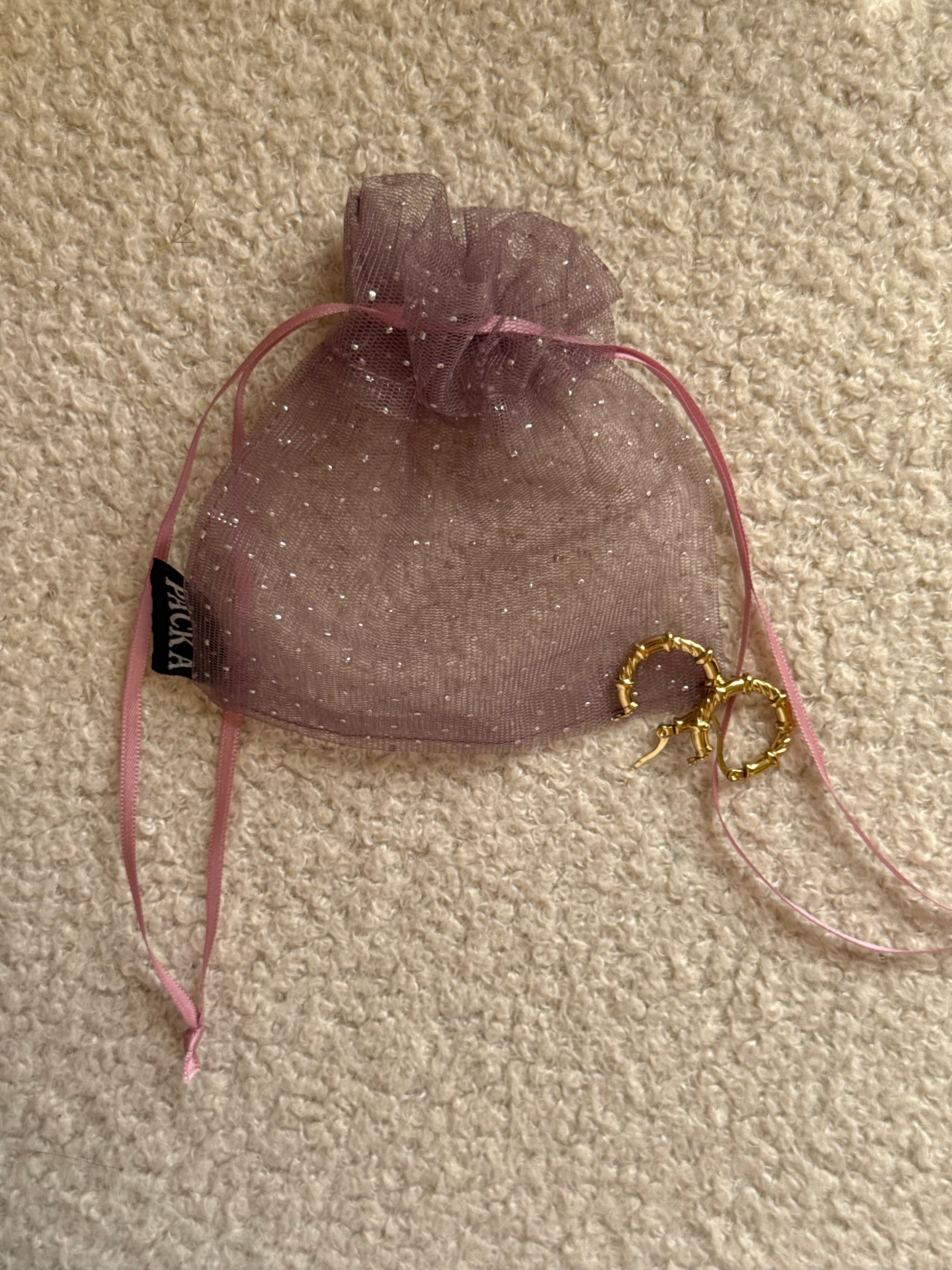 A delicate sheer organza drawstring pouch designed to add a touch of elegance and luxury to product packaging.